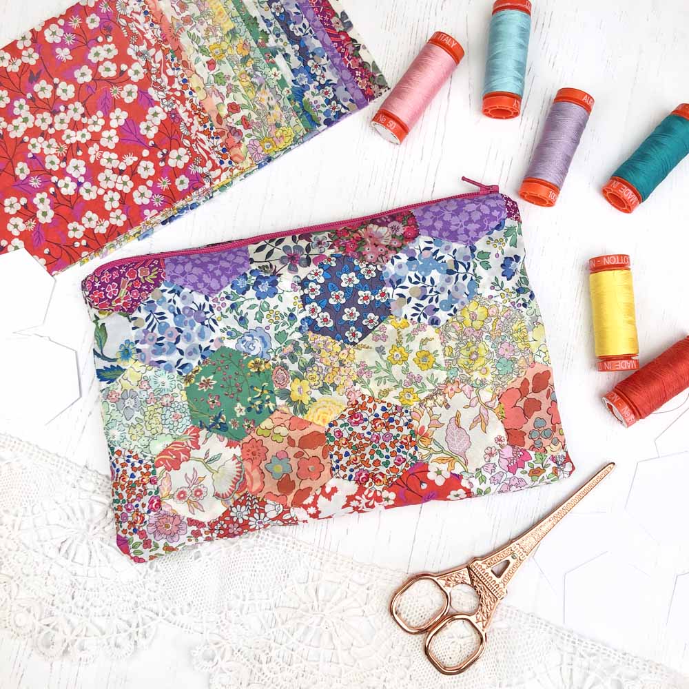 You will be shown how to make the EPP hexagons and then use the joined hexagons as the outer fabric on a simple pouch tutorial. The EPP method is actually very simple- and addictive! Once the EPP has been completed construction of the pouch is simple and quick, great for a beginner sewer to make using the sewing machine, or by hand with a needle and thread. You will learn how to insert a simple zip and line the pouch for a neat finish inside as well as out.